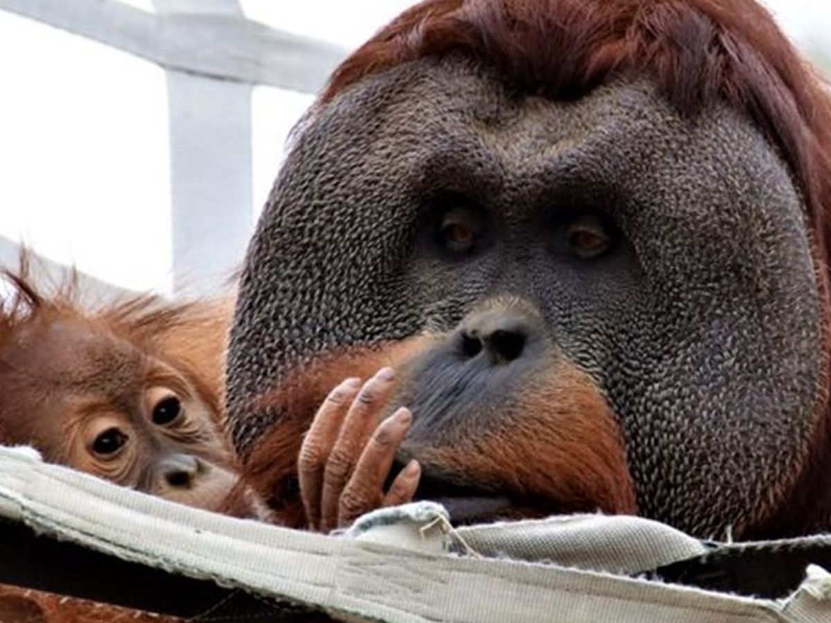 This orangutan cares for his baby the same way her mama would do. Baby Sumatran orangutan Ginger loves her papa. 17 at age 32.