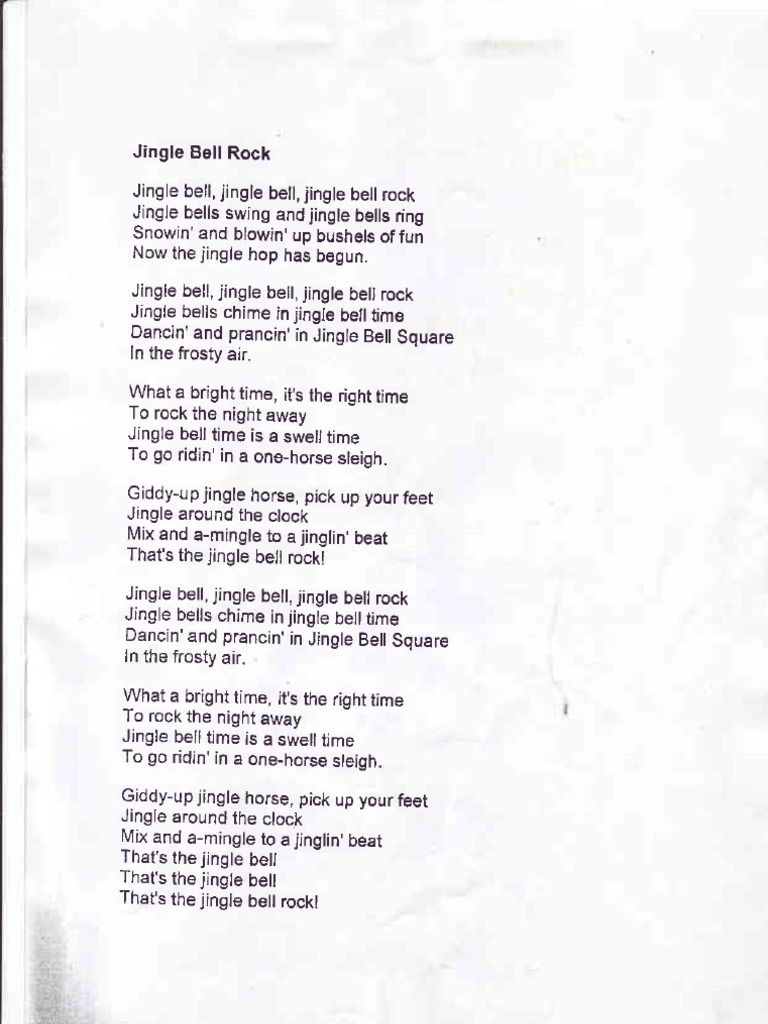 Now the jingle hop has begun. Jingle bell jingle bell Jingle bell rock Jingle bells chime in Jingle bell time Dancin and prancin In jingle bell square In the frosty air What a bright time Its the right time To rock the night away. Giddy- up jingle horse pick up your feet jingle around the clock mix and migle in a jinglin beat thats the jingle bell rock.